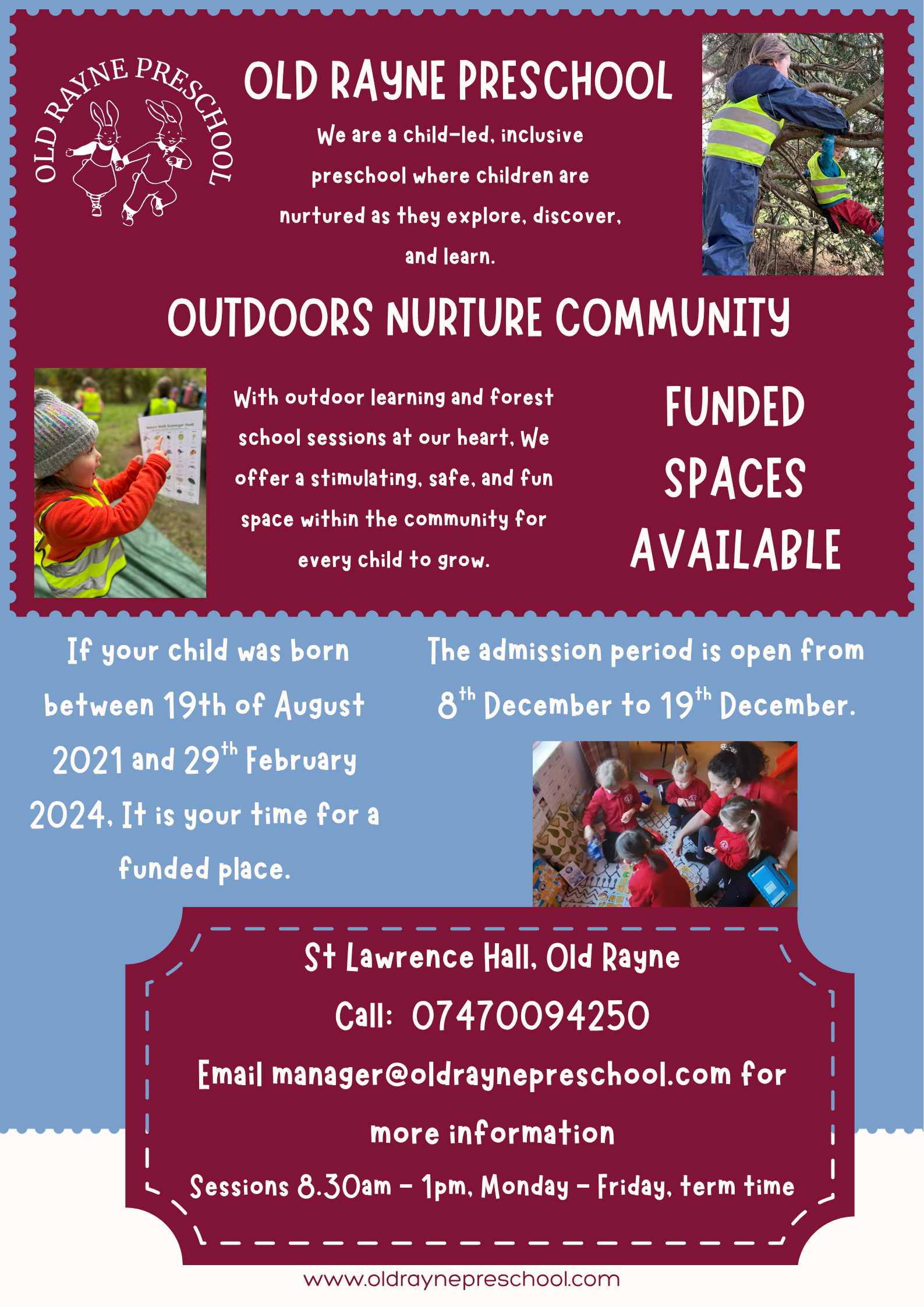 Old Rayne Preschool is a wonderful setting. All my children have attended here and have had the best time. There is a fantastic staff team who are so nurturing to all the children. The preschool has fantastic resources for the children and a brilliant Forest School day in the spring/summer terms. There is also a brilliant mud garden for the children to explore. I couldn't recommend Old Rayne Preschool enough, its a brilliant nursery.